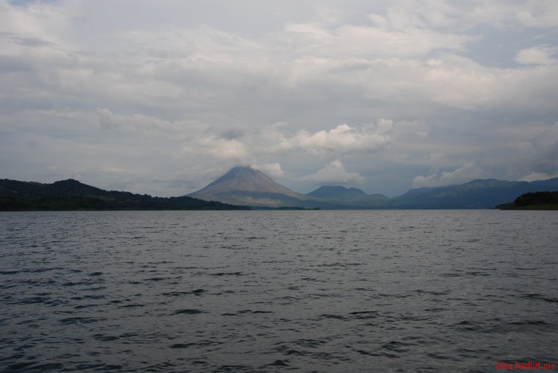 von Monteverde haben wir mit Jeep-Boat-Jeep die Abkuerzung ueber den kuenstlich angelegten See nach La Fortuna genommen. Mit hilfe von Wasserkraftwerken werden 45% der Energie fuer Costa Rica hier gewonnen. Mit dem Boot haben wir geradewegs auf den Vulkan Arenal zugehalten, an dessen Fuss sich der See erstreckt.