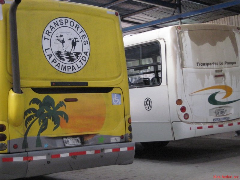 Da Samar nicht direkt zu erreichen ist, holpern wir zunaechst nach Santa Cruz. Der freundliche Fahrer hat ein Auge auf die einzigen Touris im Bus geworfen und setzt uns an der richtigen Stelle im Ort ab, so dass wir bis zum naechsten Busbahnhof nicht mehr weit zu laufen haben. Dort loesen wir ein Ticket nach Nicoya. Sonja bekommt gerade noch einen Stehplatz im Bus – waehrend ich mich an meine aktive Zeit als S-Bahn Surfer erinnert fuehle (habe so was zwar nie gemacht, aber genau so muss es sich anfuehlen). Der Fahrtwind war durchaus erfrischend. „Transportes La Pampa“ 😉