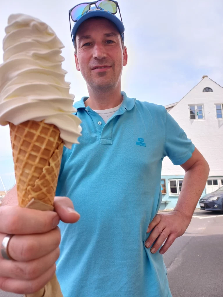 - Auf dem Rückweg zum Campingplatz noch ein stop am Haken beim Eismann, wo der Frank ein gigantische Softeis bekommen hat und Und an unserem letzten gemeinsamen Abend haben Freddy und Frank voll bepackt mit Lebensmitteln noch mal zum Grillen bei uns vorbeigeschaut.
