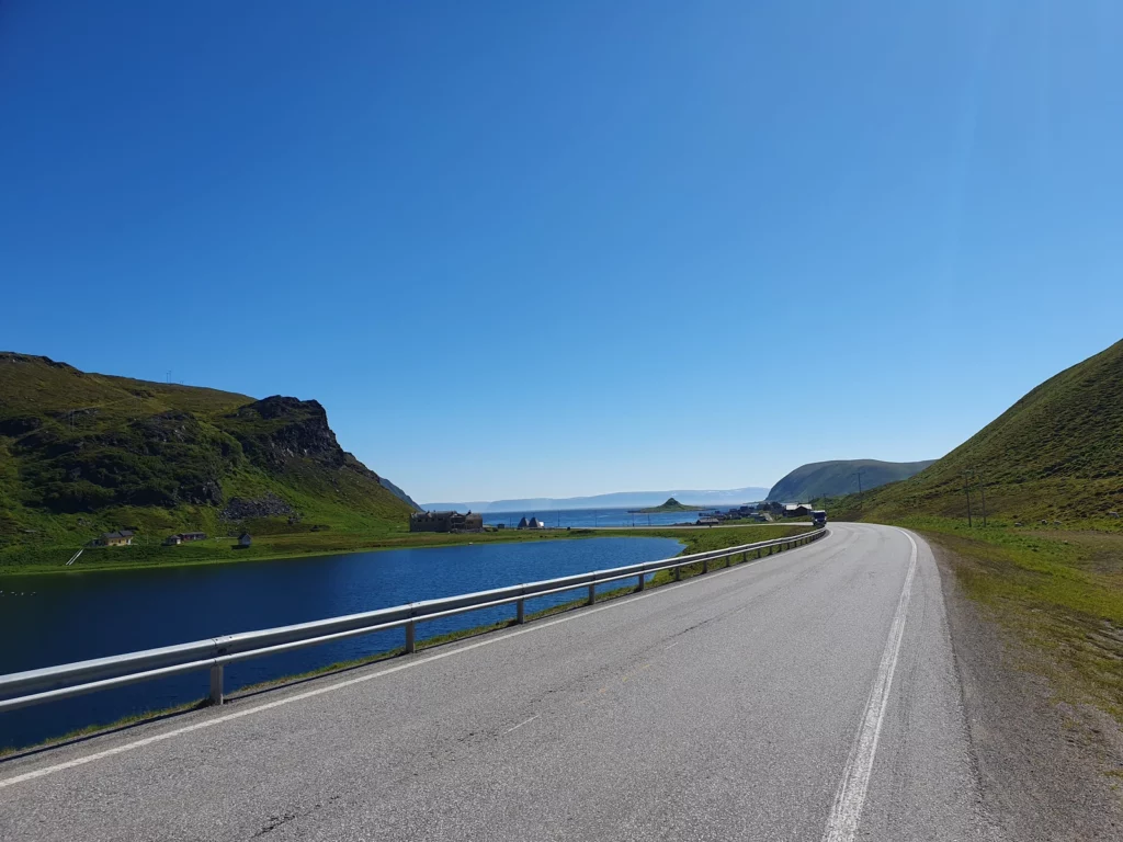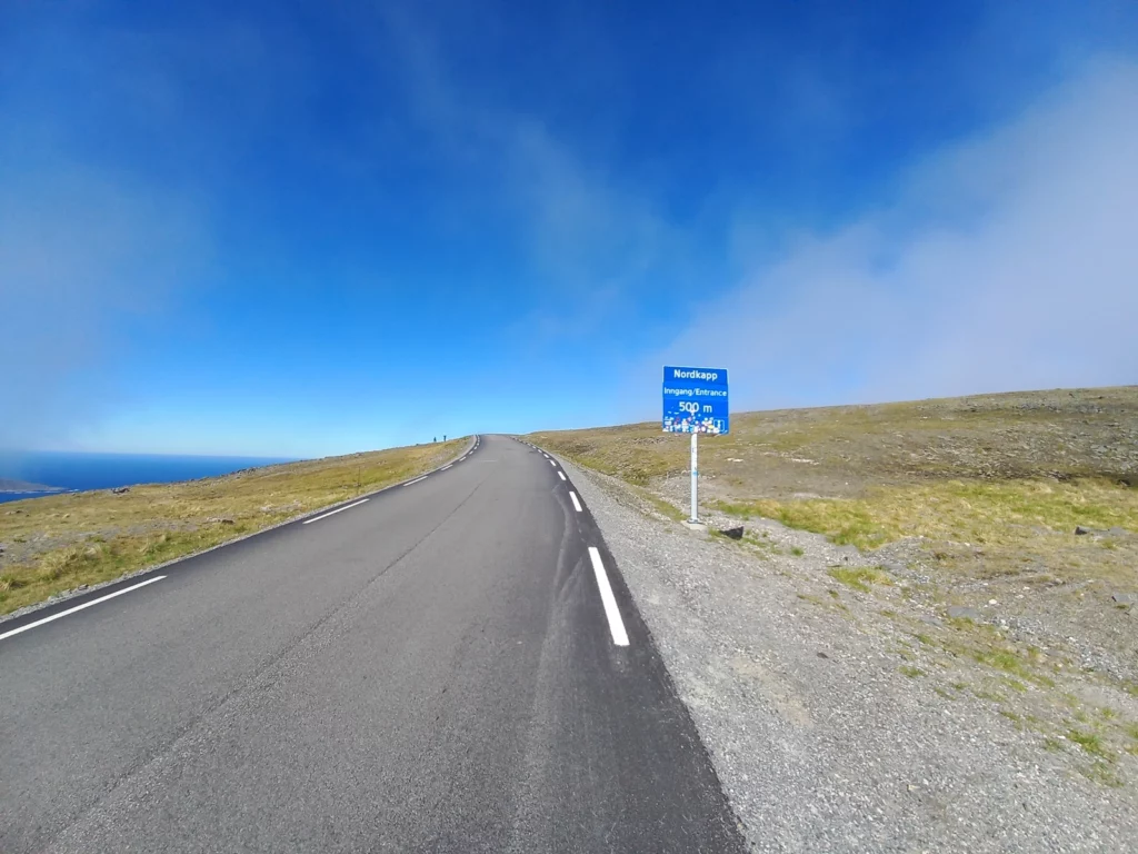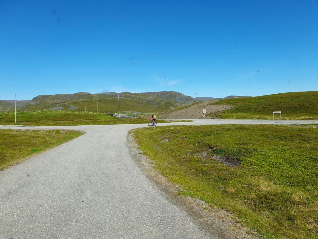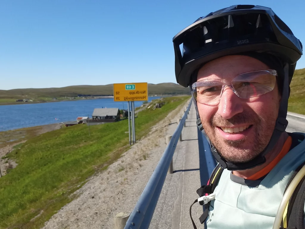 Die Tour entlang des EuroVelo 1 ist atemberaubend schön. Bei perfektem Wetter mit 15 °C und Sonnenschein genießt Frank die Strecke. Besonders beeindruckend ist der Nordkaptunnel, der 212 m unter dem Meer verläuft und am Anfang und Ende jeweils eine Steigung von 10% hat. Mit reflektierenden Materialien gut ausgestattet, schafft Frank die 70 km und 1200 Höhenmeter!