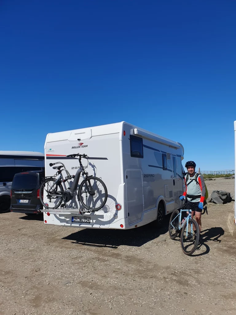 - Nach dem Frühstück mit dem Wohnmobil bis 70 km vor dem Nordkap gefahren, Frank beginnt seine Radtour