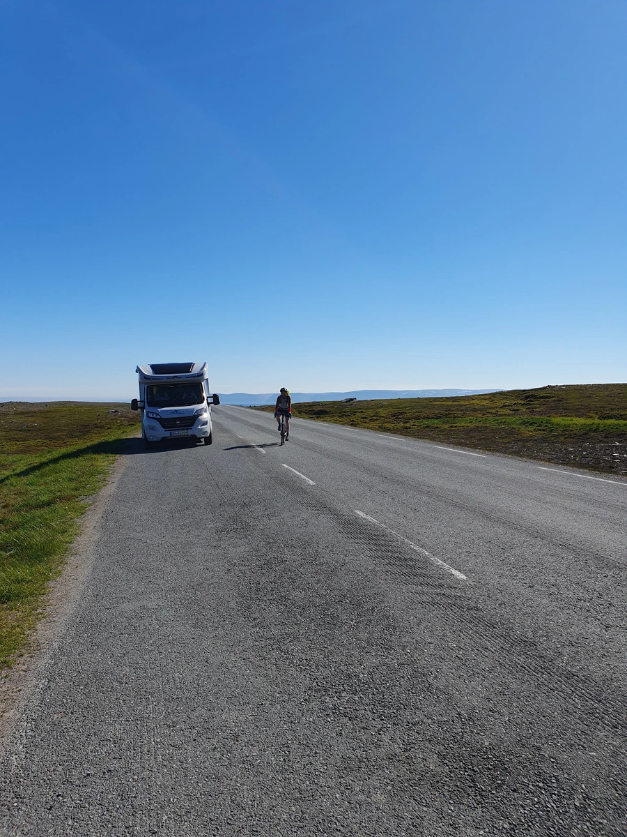 - Nach dem Frühstück mit dem Wohnmobil bis 70 km vor dem Nordkap gefahren, Frank beginnt seine Radtour