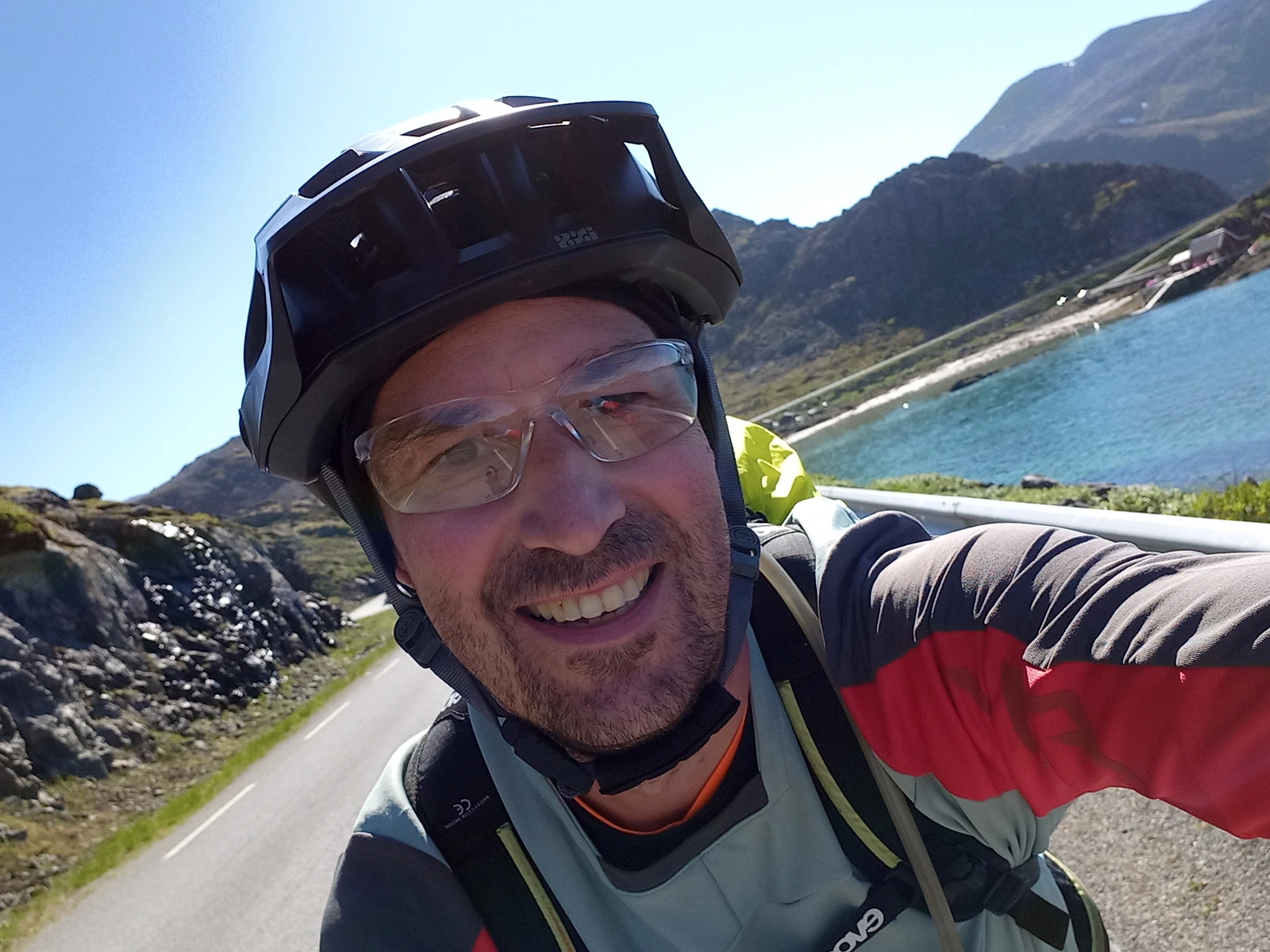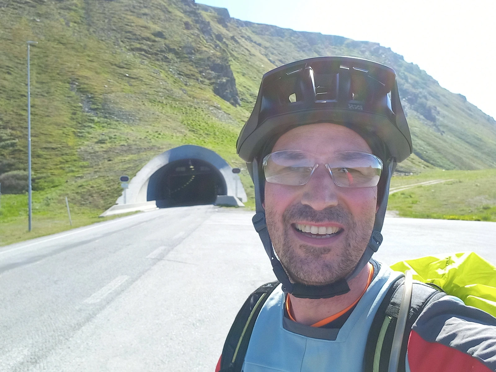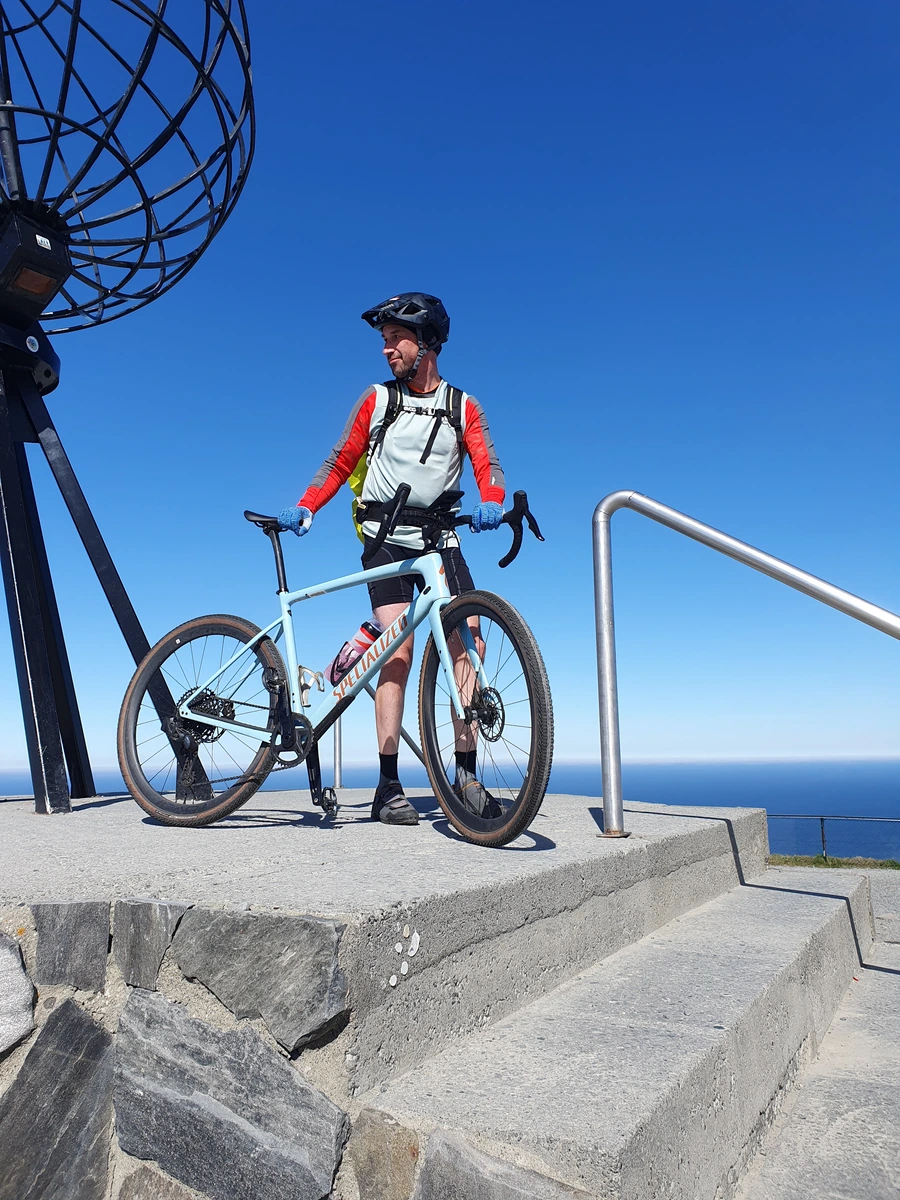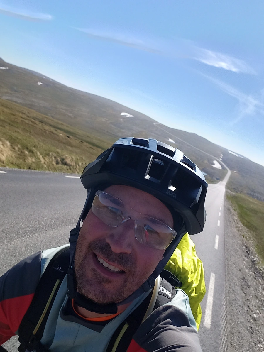 Die Tour entlang des EuroVelo 1 ist atemberaubend schön. Bei perfektem Wetter mit 15 °C und Sonnenschein genießt Frank die Strecke. Besonders beeindruckend ist der Nordkaptunnel, der 212 m unter dem Meer verläuft und am Anfang und Ende jeweils eine Steigung von 10% hat. Mit reflektierenden Materialien gut ausgestattet, schafft Frank die 70 km und 1200 Höhenmeter!