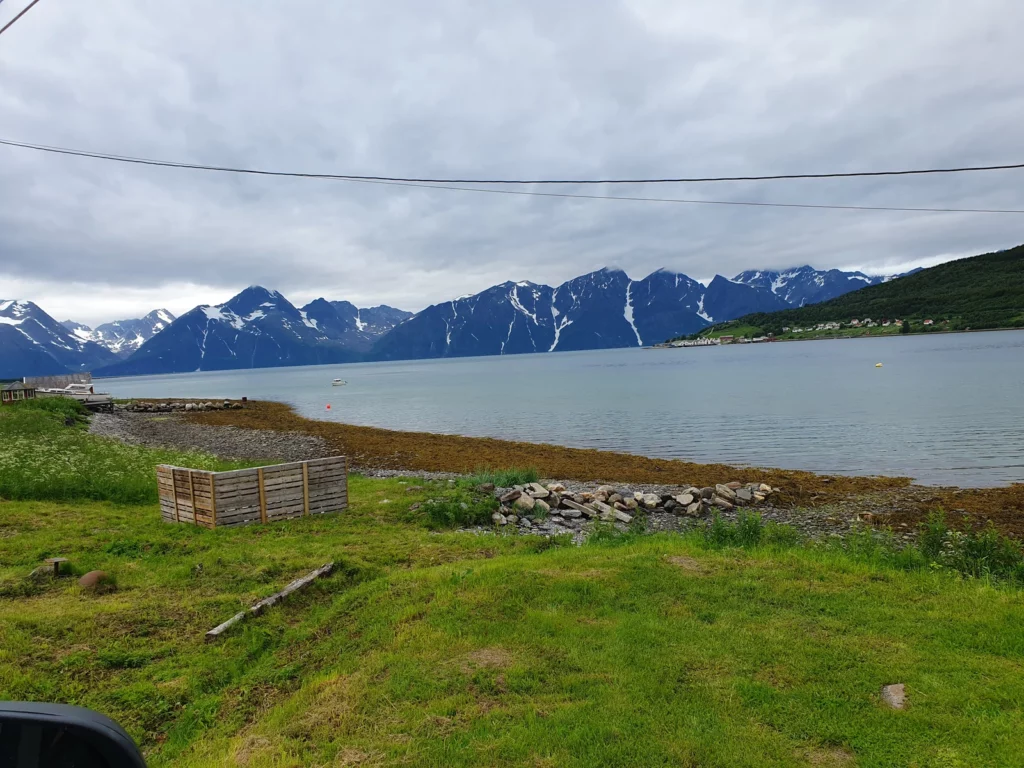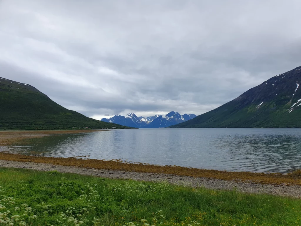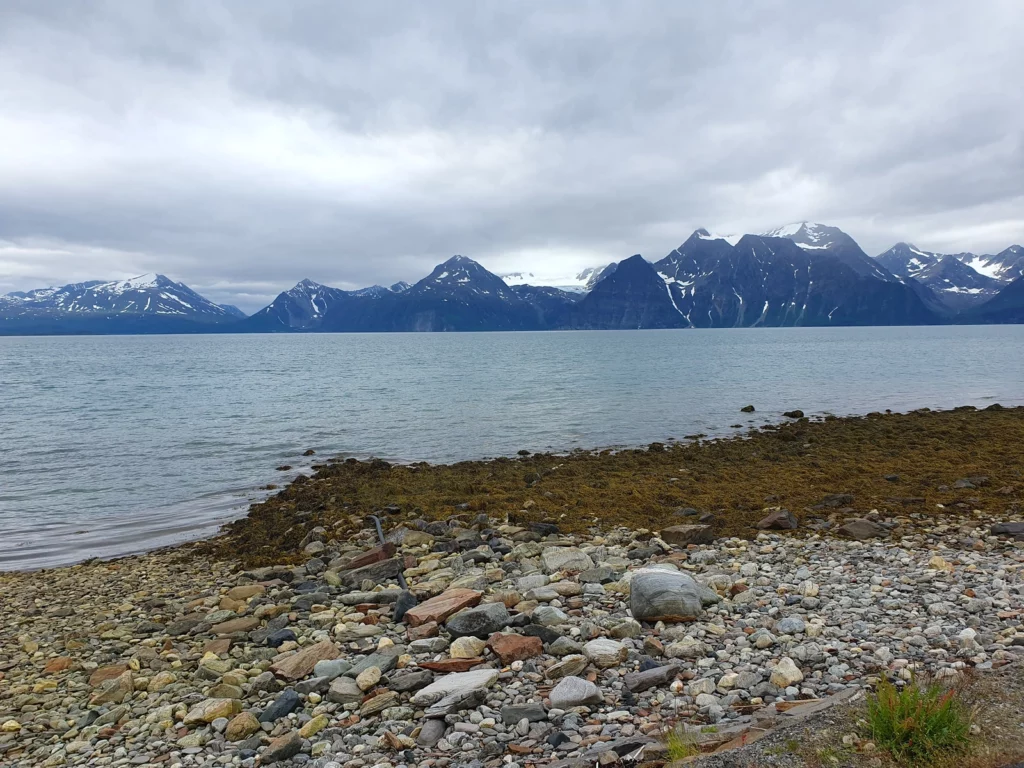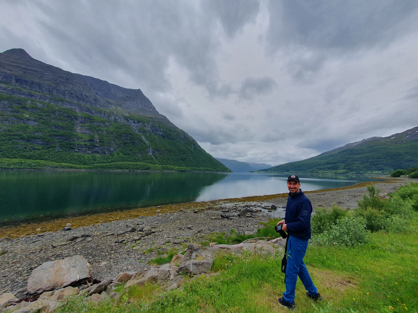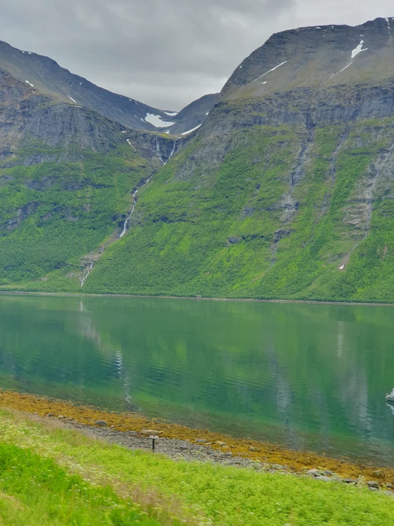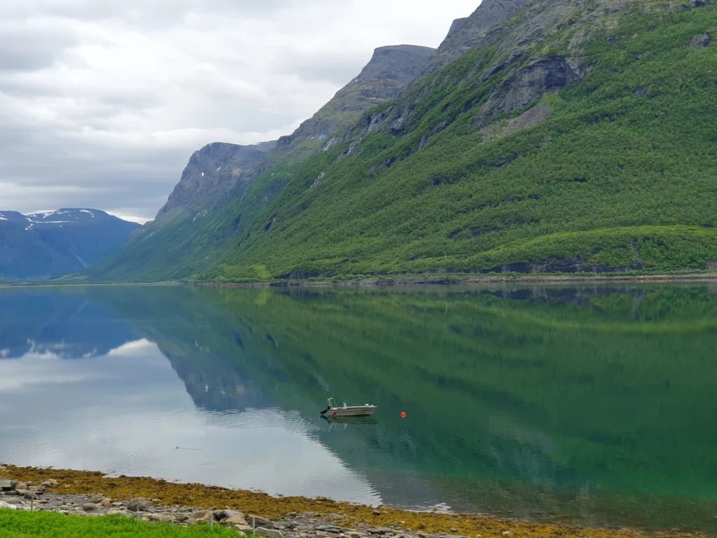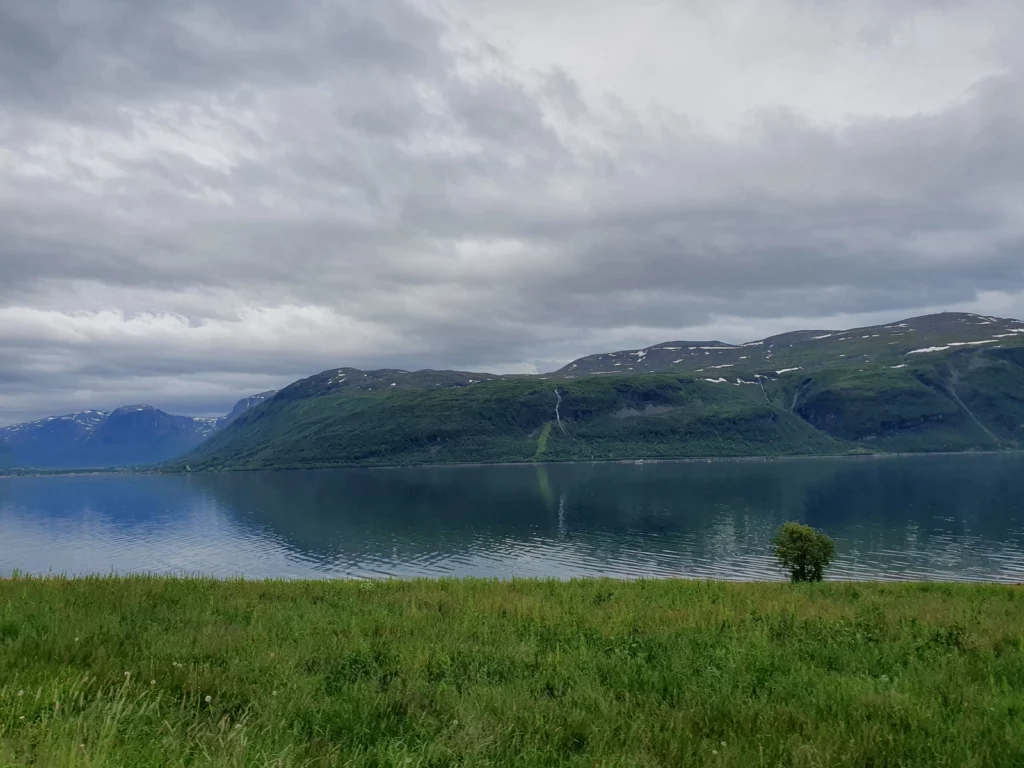 - Auch wenn der Himmel heute uns hauptsächlich mit fröhlichem Grau begleitet sind die Erhebungen doppelt schön, so wie sie sich im stillen Fjordwasser spiegeln.