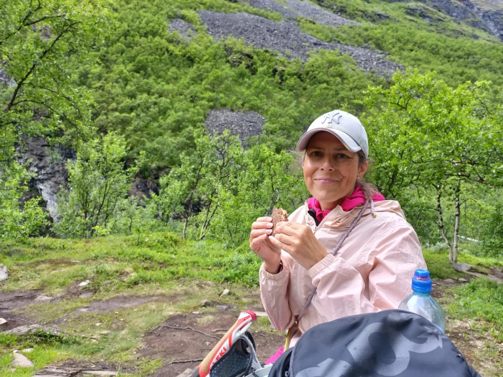 Weiter geht’s zur Gorsabrua, eine Alu-Brücke über eine tiefe Schlucht mit atemberaubendem Blick auf einen herabstürzenden Wasserfall. Die Geräuschkulisse ist gewaltig. Die Anfahrt von 4 km führt uns durch Serpentinen und vorbei an einer Schafherde, die den Weg blockiert. Nirgends schmeckt eine selbst geschmierte Stulle so gut, wie nach einer kleine Wanderung am Ziel.