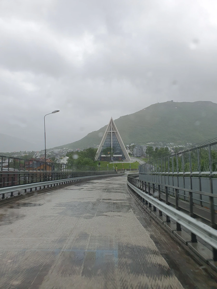 - Und schon halten wir auf Tromsø zu. Drehen eine Ehrenrunde durchs Zentrum bis zum Campingplatz und ergattern gleich zwei Mal den Blick auf die Eiskathedrahle mit ihrer markanten, einzigartigen Architektur.