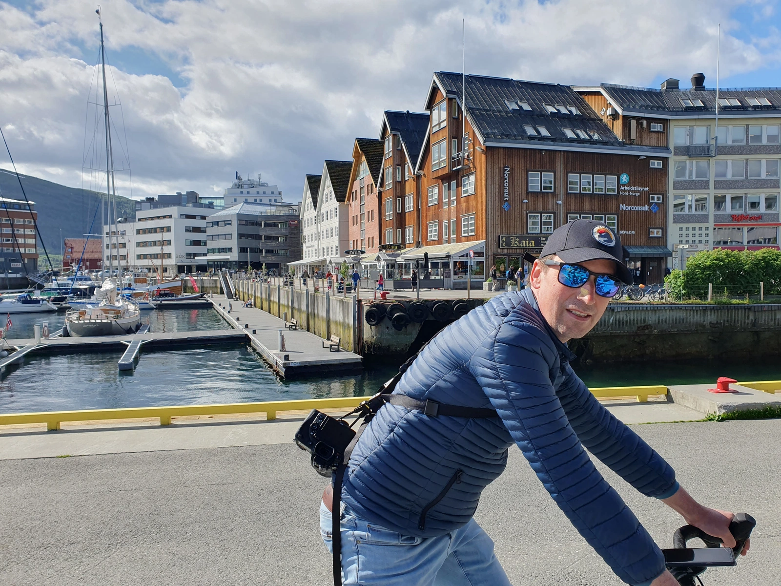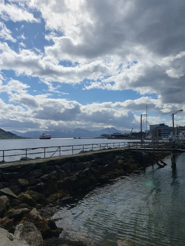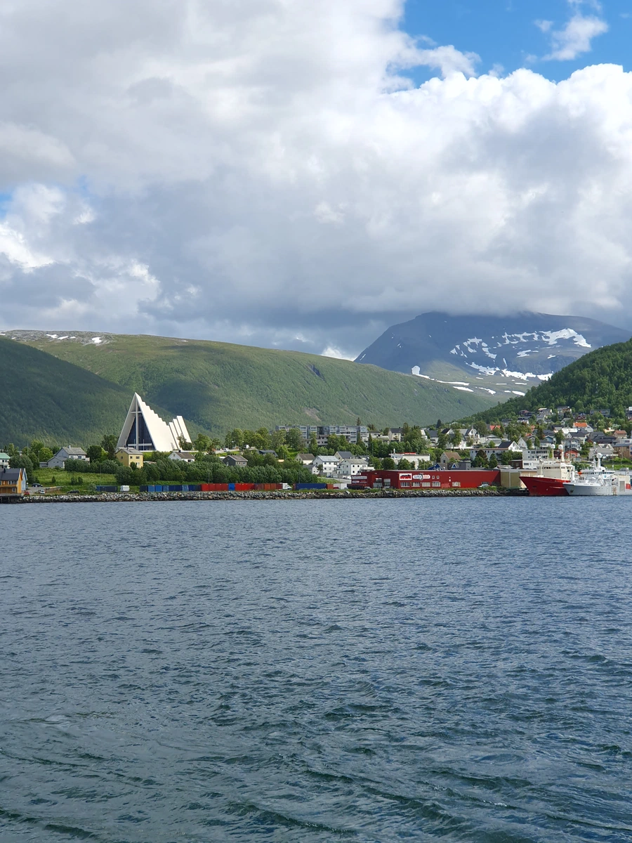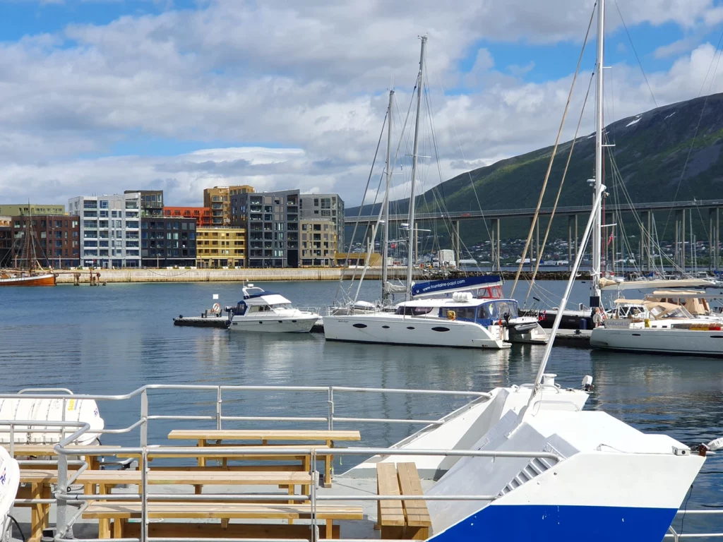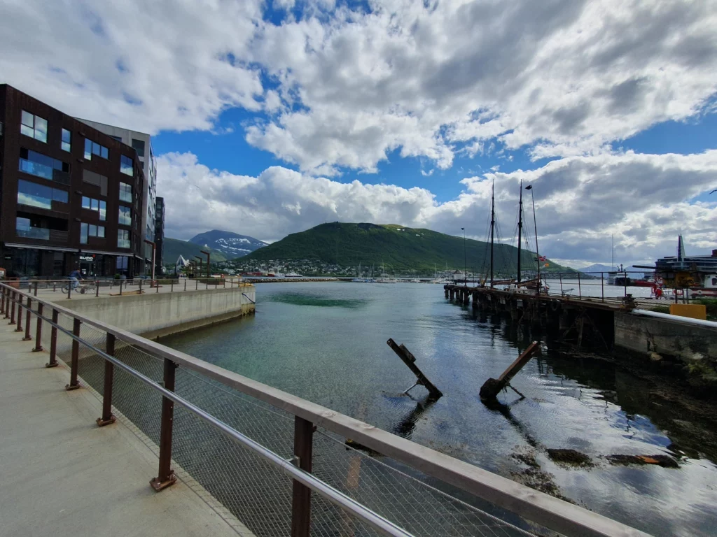 Heute erkunden wir Tromsø mit dem Fahrrad. Schon auf dem Weg zum Polaria-Museum entdecken wir so viel Schönes – Brücke, Hafen, Eiskathedrale, Fischerhäuser, Fischerboote und die Altstadt – dass wir ständig anhalten, um Fotos zu machen. Der Sonnenschein und viel blauer Himmel zwischen ein paar Wolken machen die Tour perfekt.