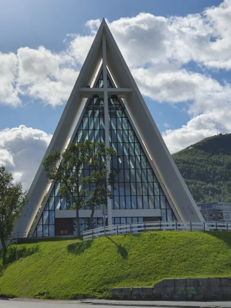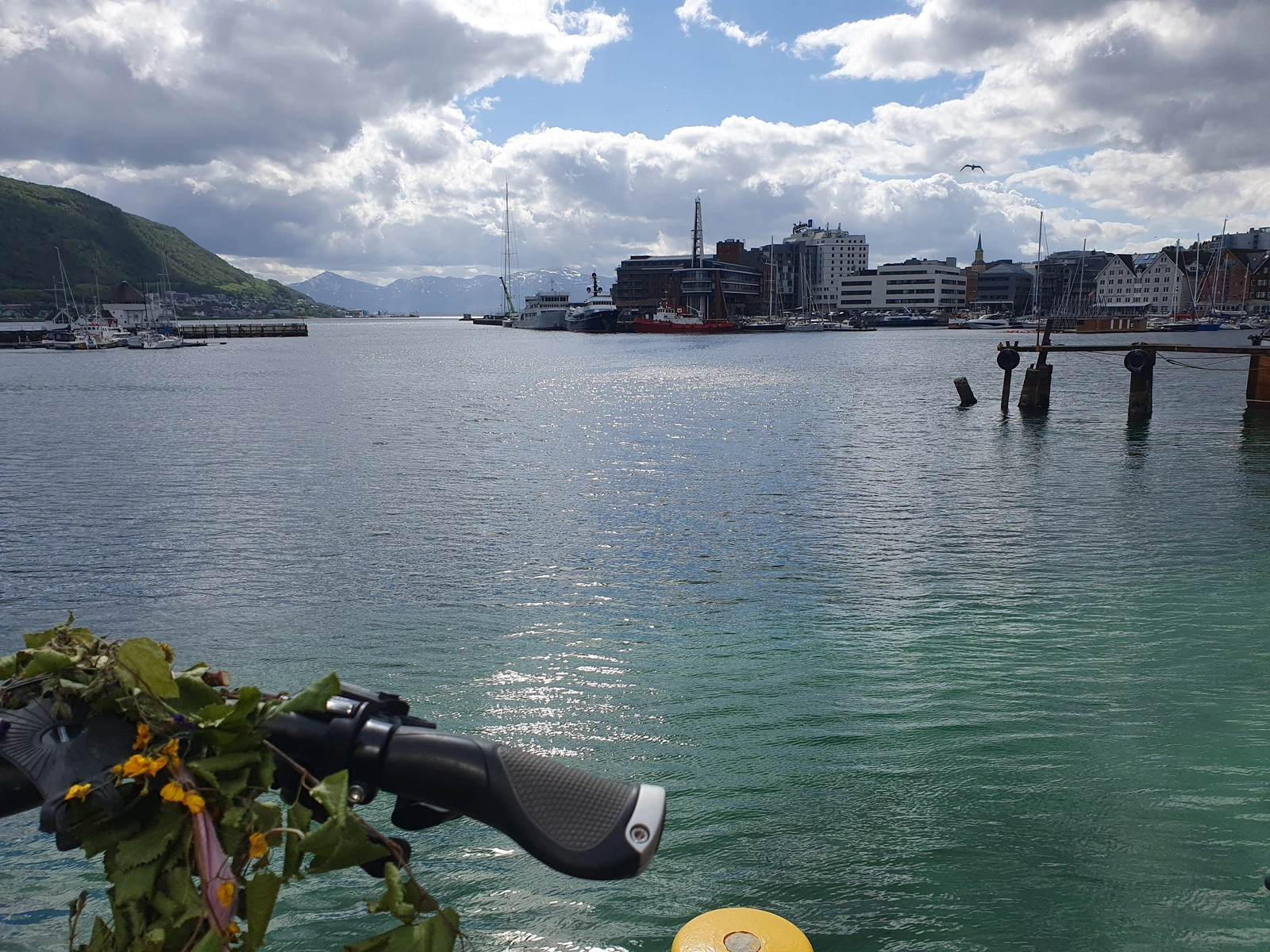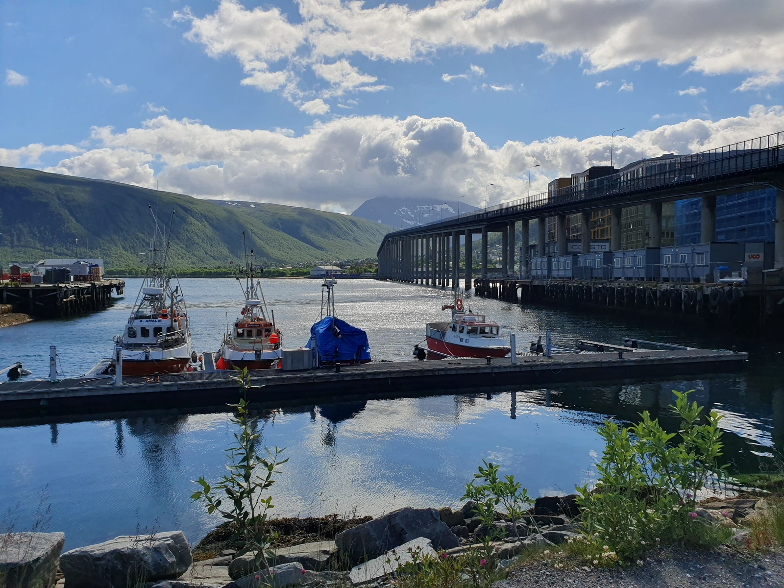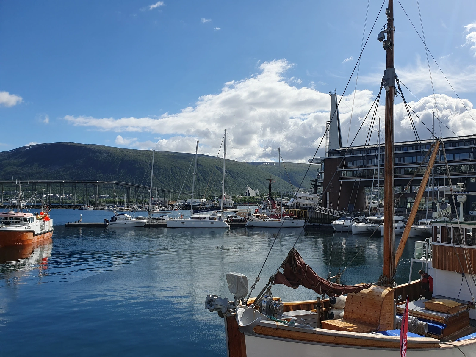 Heute erkunden wir Tromsø mit dem Fahrrad. Schon auf dem Weg zum Polaria-Museum entdecken wir so viel Schönes – Brücke, Hafen, Eiskathedrale, Fischerhäuser, Fischerboote und die Altstadt – dass wir ständig anhalten, um Fotos zu machen. Der Sonnenschein und viel blauer Himmel zwischen ein paar Wolken machen die Tour perfekt.