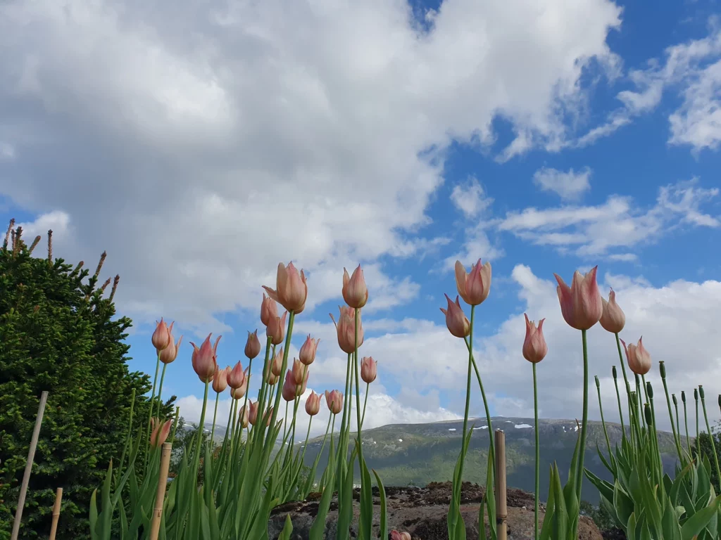 Bevor das Hurtigruten-Schiff die Passagiere tägl. um 14 Uhr in die Stadt spült, gönnen wir uns eine Pause in der Bäckerei Vervelt in der Neustadt. Die moderne Location im neuen Hafenviertel bietet einen tollen Blick auf den Fjord. Gestärkt geht es weiter zum botanischen Garten, wo wir blaue Mohnblumen aus dem Himalaya und Tibet in verschiedenen Blau- und Rottönen bewundern. Zum Abschluss des Tages entscheidet Frank, selbst Burgerpattys zu machen – und sie sind einfach lecker!