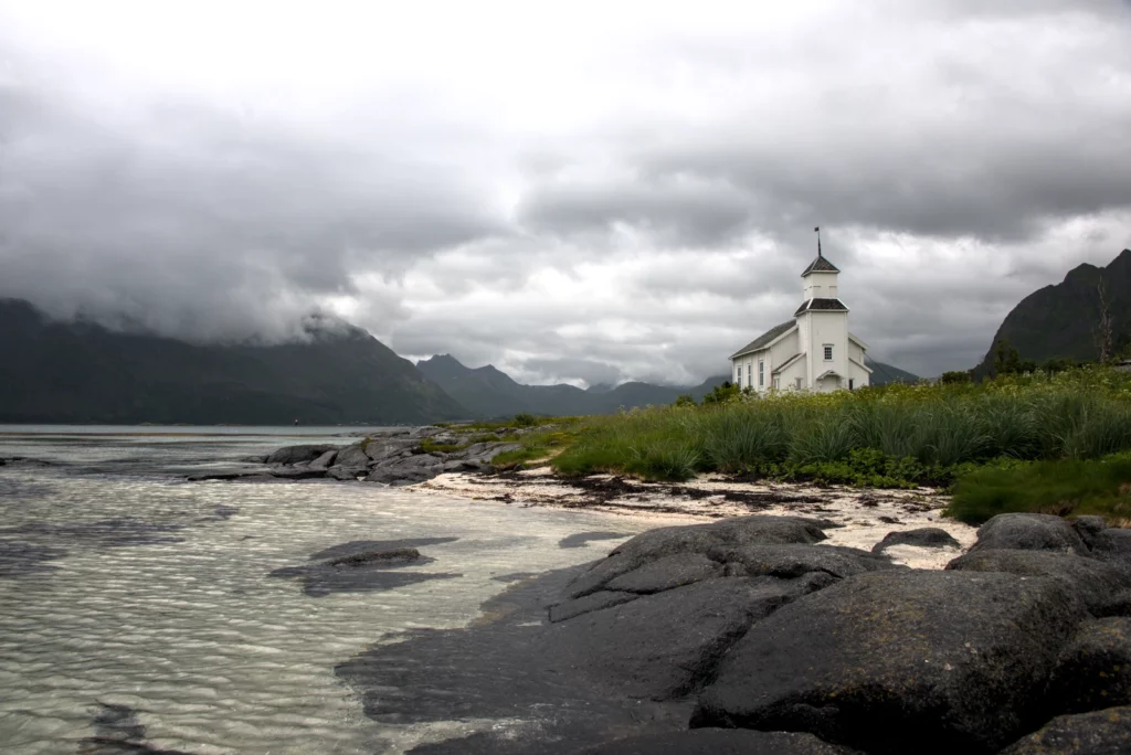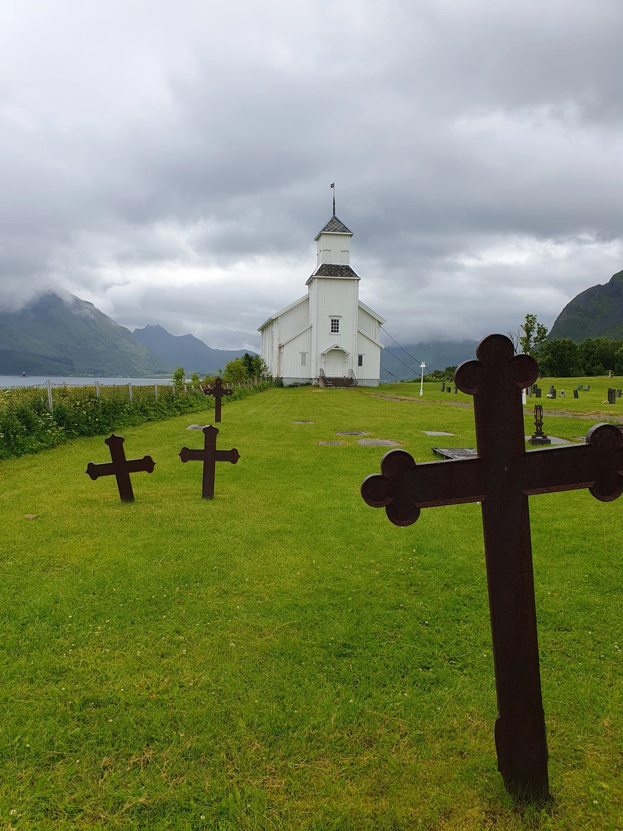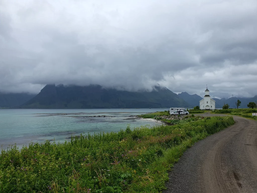 - Auf Gimsøya wenden wir uns ab von der E10 hin zur idyllischen Nordöstliche-Route. Legen einen Stopp an der weißen Holz-Kirche Gimsøyasand-Kirche ein und bestaunen auch die wunderschöne Bucht mit dem weißen Sand durchbrochen mit groben dunklem Fels. Die Kirch wird auf der Landseite Mitstahlseilen gesichert um sie vor Fallsinden zu schützen.