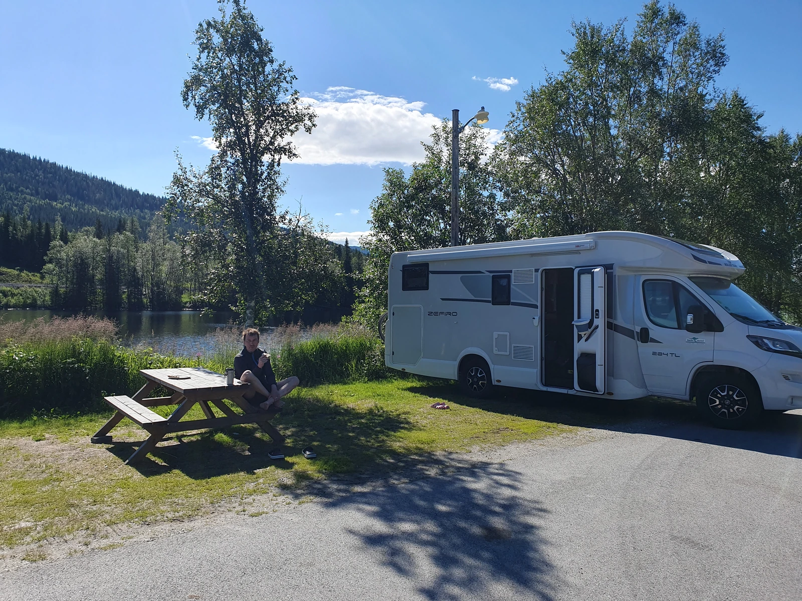 Unser Campingplatz direkt am Fluss sah auf den ersten Blick ruhig aus, doch die Bahnstrecke auf der einen Seite und die E6 auf der anderen machten die Nacht unruhiger als erwartet. Immerhin waren die Duschen unbegrenzt und schön warm! Beim Frühstück in der Sonne entscheidet Frank, die letzten 60 km nach Trondheim zu radeln, aber der einsetzende Regen lässt uns diesen Plan ändern. Stattdessen nehmen ich ihn weiter im Wohnmobil mit.