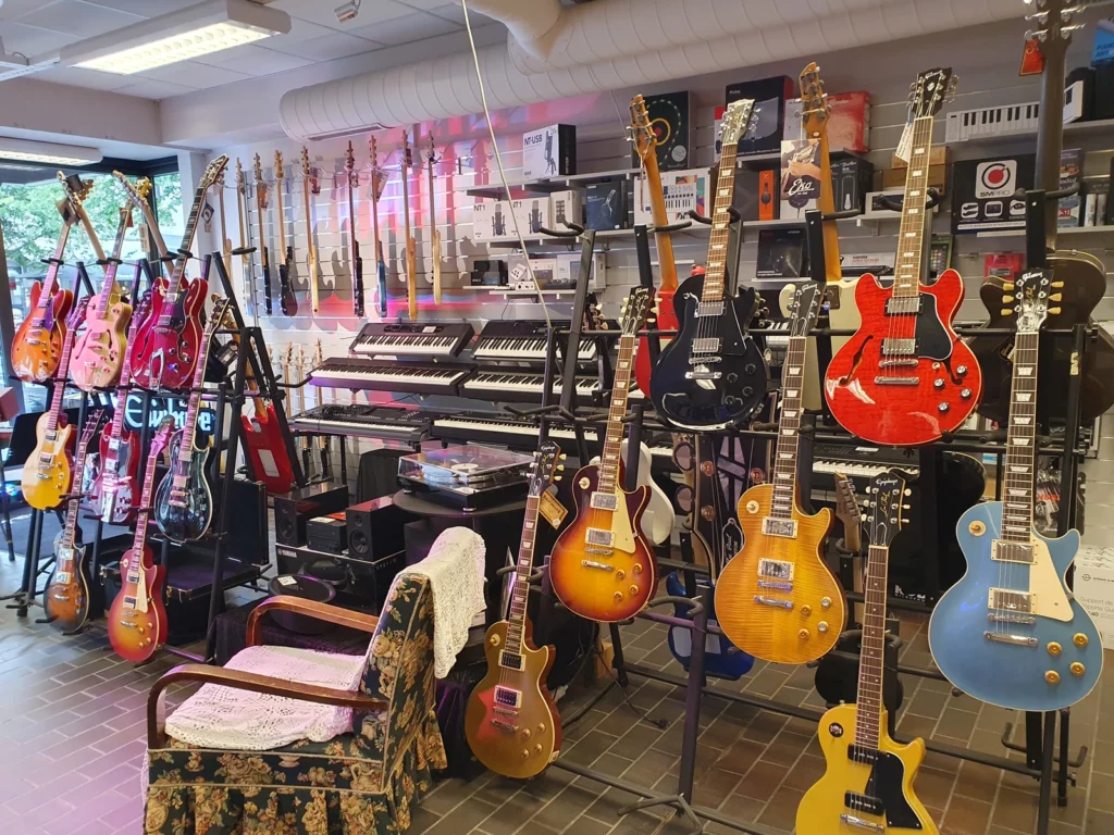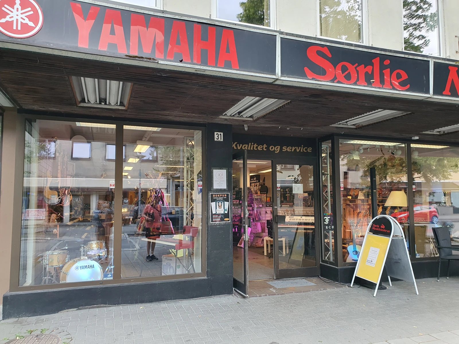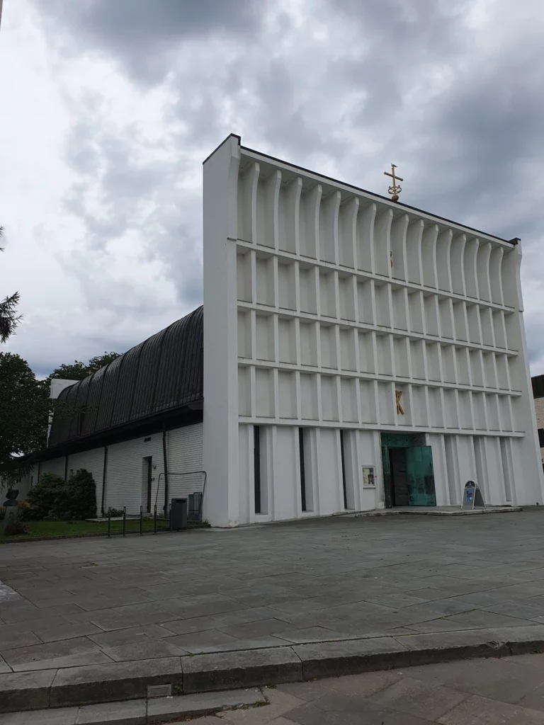 Bei unserem Café-Stop in Steinkjer bummeln wir an einem sehr leidenschaftlich eingerichteten Gitarren-Store vorbei. Stefan und Niklas hätten ihren Spaß in dem Laden. 😉🎸 Auch die Kirche hat eine Interessante Front.