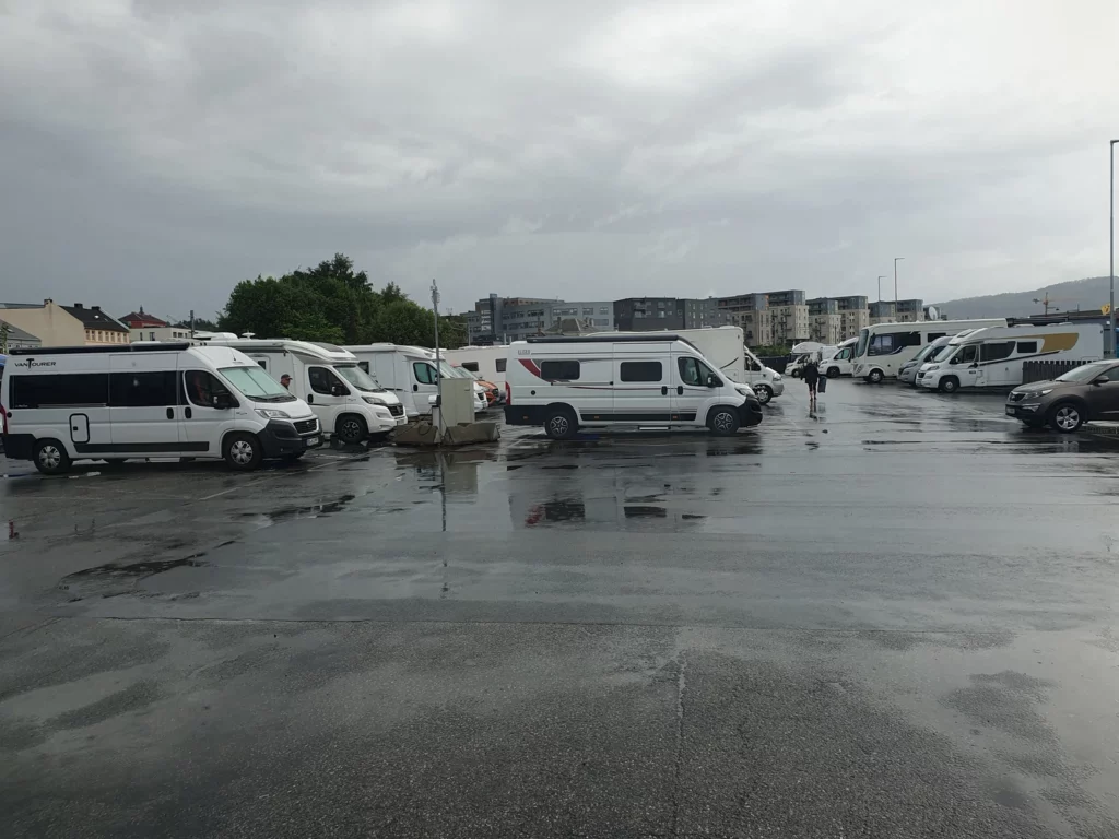 Gegen 17 Uhr erreichen wir Trondheim und bekommen noch einen Platz auf dem begehrten, zentrumsnahen WoMo-Stellplatz (350 Nok/Nacht) nur teilw. mit Strom