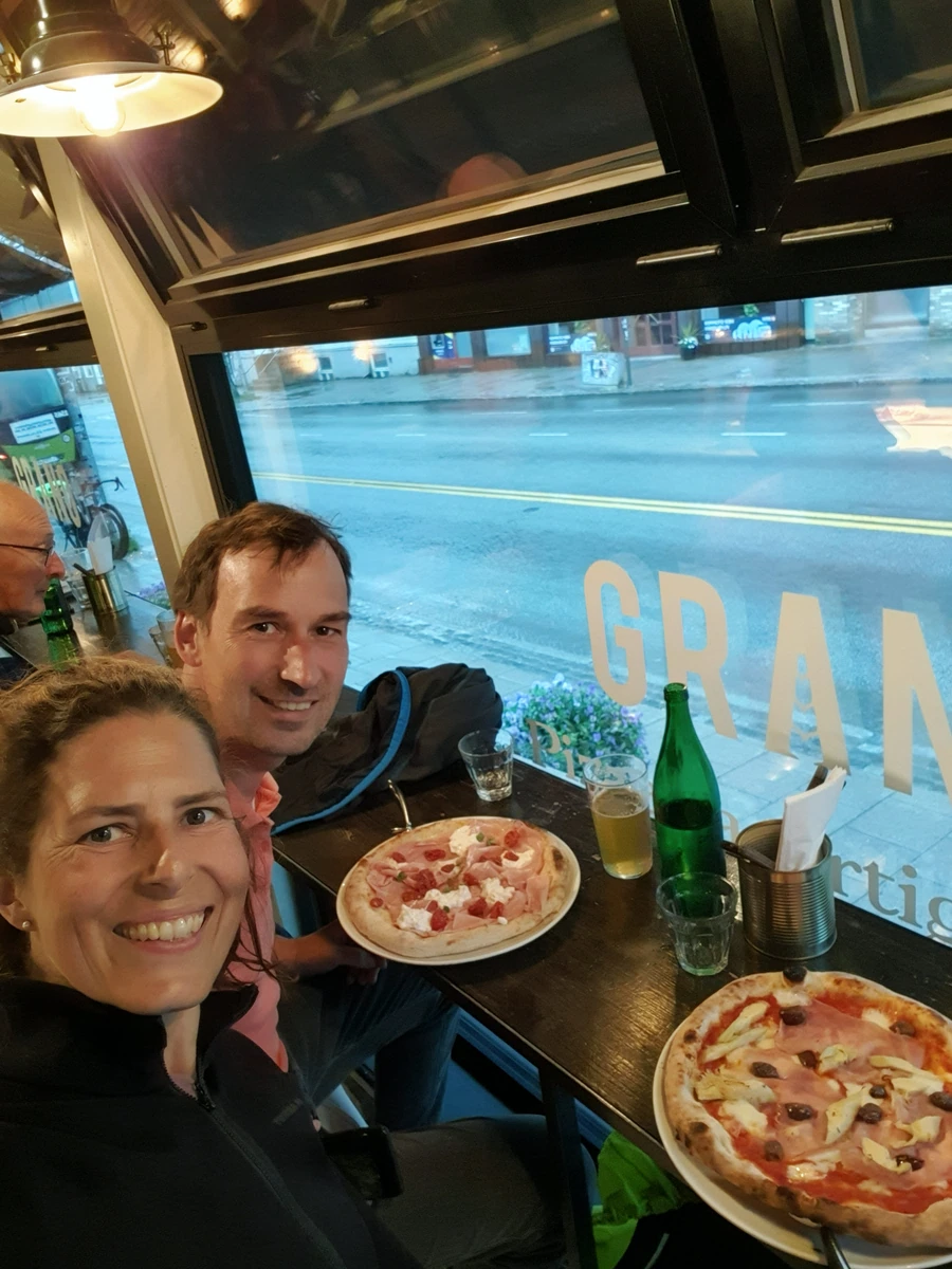 Gegen 17 Uhr erreichen wir Trondheim und ergattern einen Platz auf dem begehrten, zentrumsnahen Wohnmobil-Stellplatz. Eingepackt in Regenjacken, machen wir uns auf den Weg und entdecken eine Pizzeria mit köstlich duftender, neapolitanischer Pizza – sogar die Italiener neben uns sind begeistert.