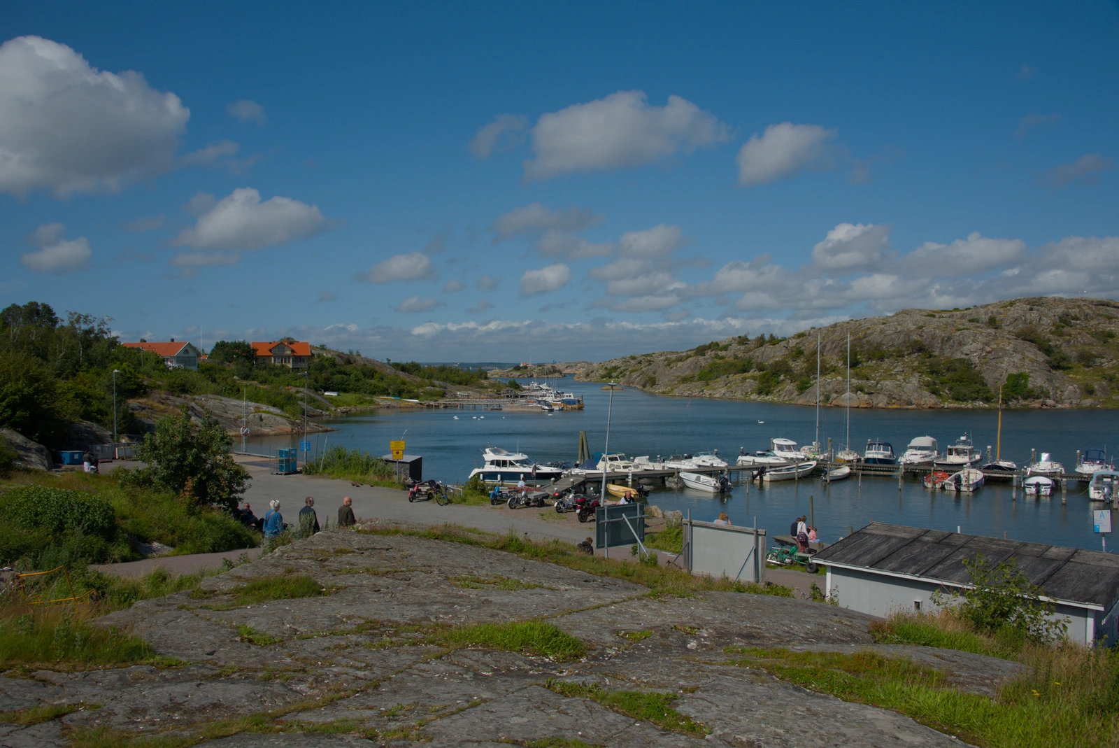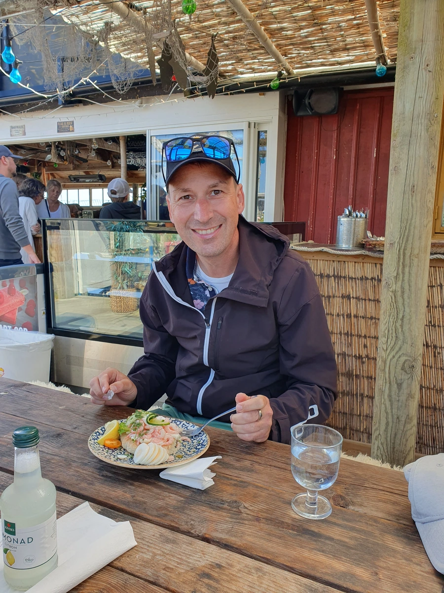 Auf Brännö angekommen, starten wir unseren Tag in einer coolen Surfer-Sea-Bar. Nach einer kleinen Stärkung zeigt uns Frank als fabelhafter Guide die Insel. Edda, mit ihren 82 Jahren, meistert tapfer den Weg über Stock, Stein und Matsch – einfach klasse! Mit perfektem Timing sind wir 15 Minuten vor Abfahrt wieder am Fähranleger. Dagmar und Frank besorgen in letzter Minute noch Eis, bevor wir die Fähre zurück nehmen.